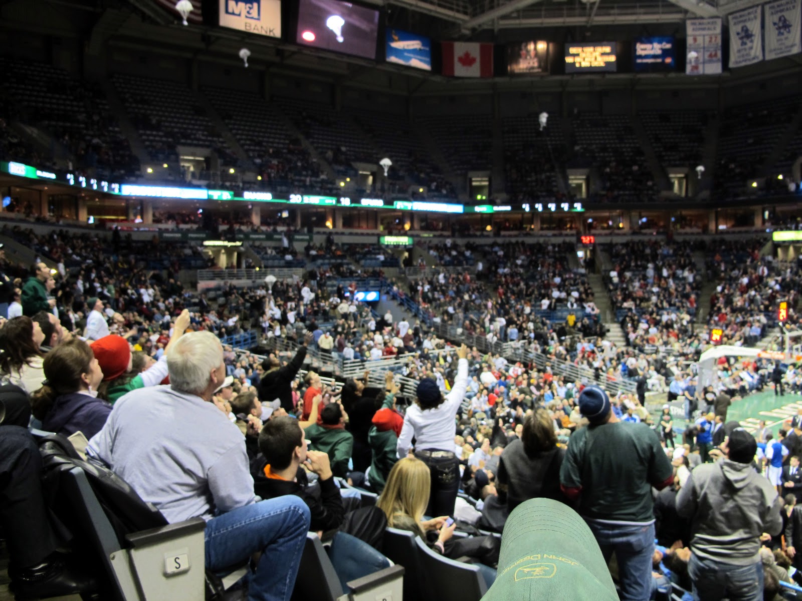 Vi var som sagt på basketmatch ikväll, ascoolt, inte riktigt Madison Square Garden i NY, men nästan! Vi, The Bucks, är faktsikt bättre än the Knicks som spelar där, så det så. Vi spelade St Antonio fr Texas. Det kom ner påsar från taket med tshirts, folk dansade i kameran o dens rad som vann bjöds på glass, cheerleading, publiken försöker göra mål, flygande luft flygplan mm mm. Det bästa? Guess who som spelar i St Antonio? TONY PARKER!! Ni vet han som var otrogen mot Eva Longoria. Jag stalkade sönder honom.